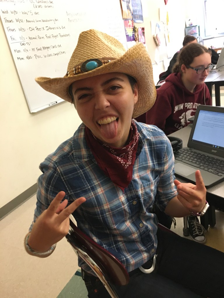 Also I’m feeling very self conscious today because the cross country team voted on spirit yesterday and they decided on cowboy spirit, but nobody else wore cowboy stuff. So here I am, looking ridiculous for seemingly no reason. I have a cowboy hat and everything, but without the rest of the squad I just look like a Texas Lesbian, so that’s fun. Not that Texas lesbians are necessarily bad, I just can’t pull off tucked in shirts and large belts. Honestly it would be a lot worse without the hat, but still, you won’t catch me dressing like this ever again.